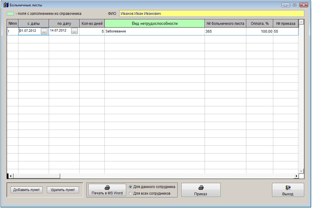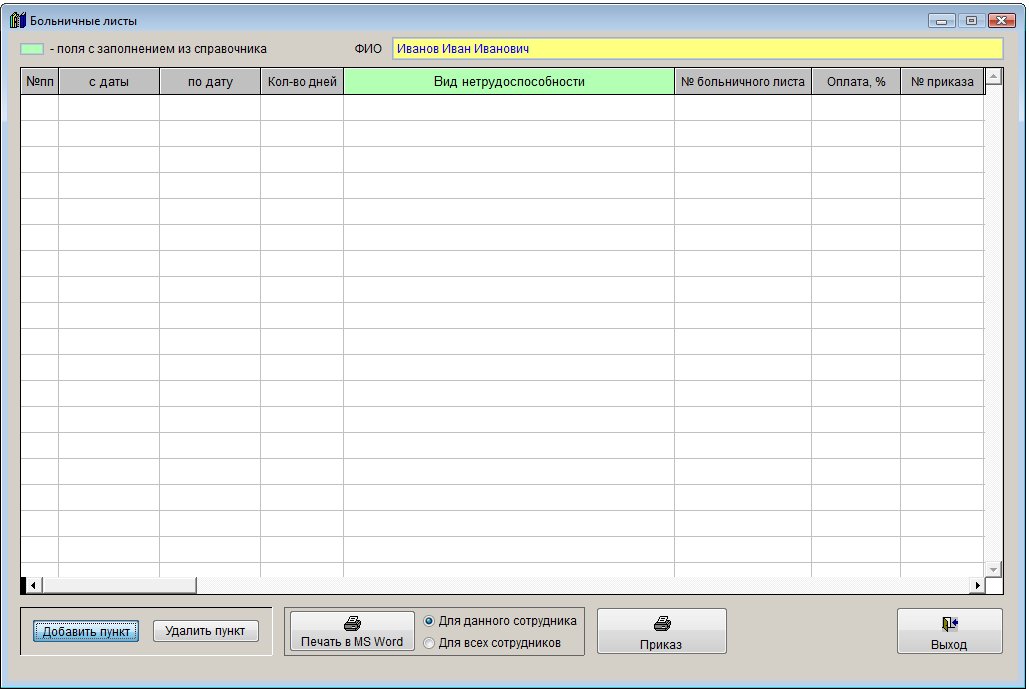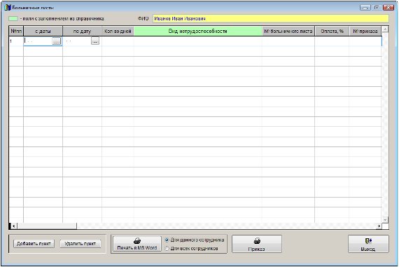 Для печати записей о больничных листах используйте нажмите кнопку "Печать в MS Word".