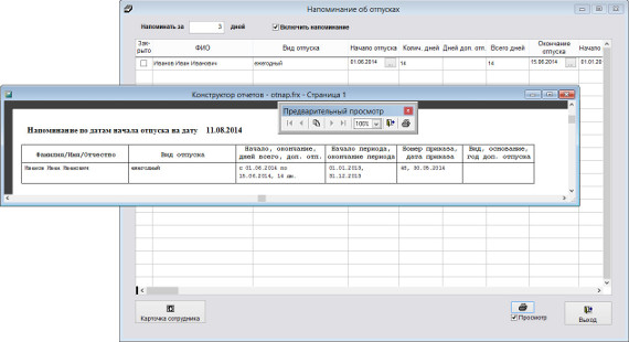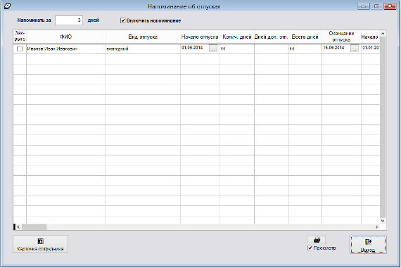 В программе "Сотрудники предприятия" можно организовать оповещение об отпусках.