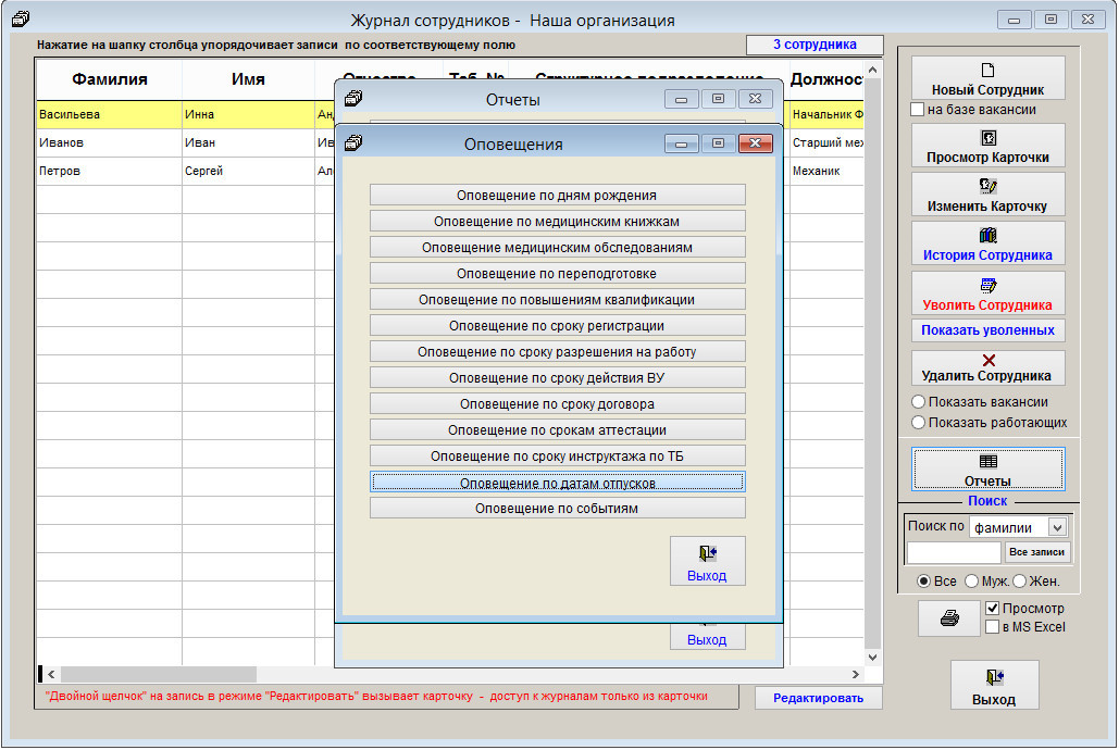 Напоминание появляется при загрузке модуля Сотрудники, также есть возможность просмотра окна напоминания в разделе Отчеты.