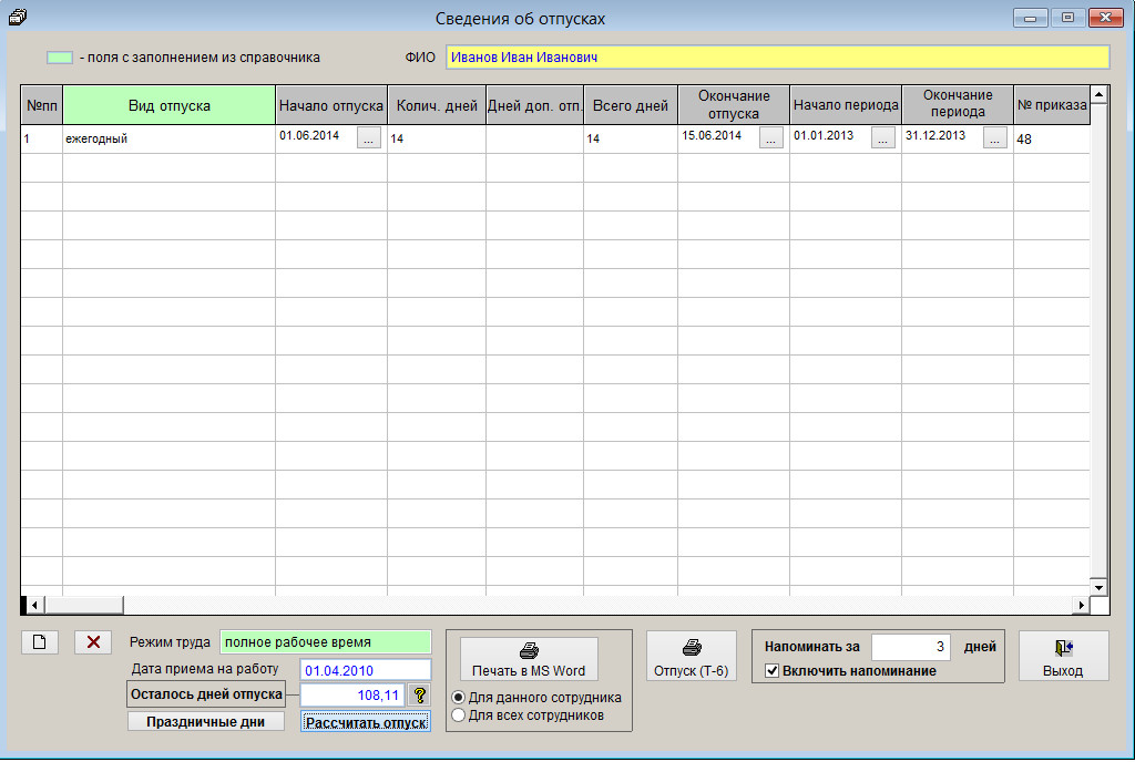 В поле "Напоминать за" указывается количество дней, за которое до даты начала отпуска начинает срабатывать оповещение.