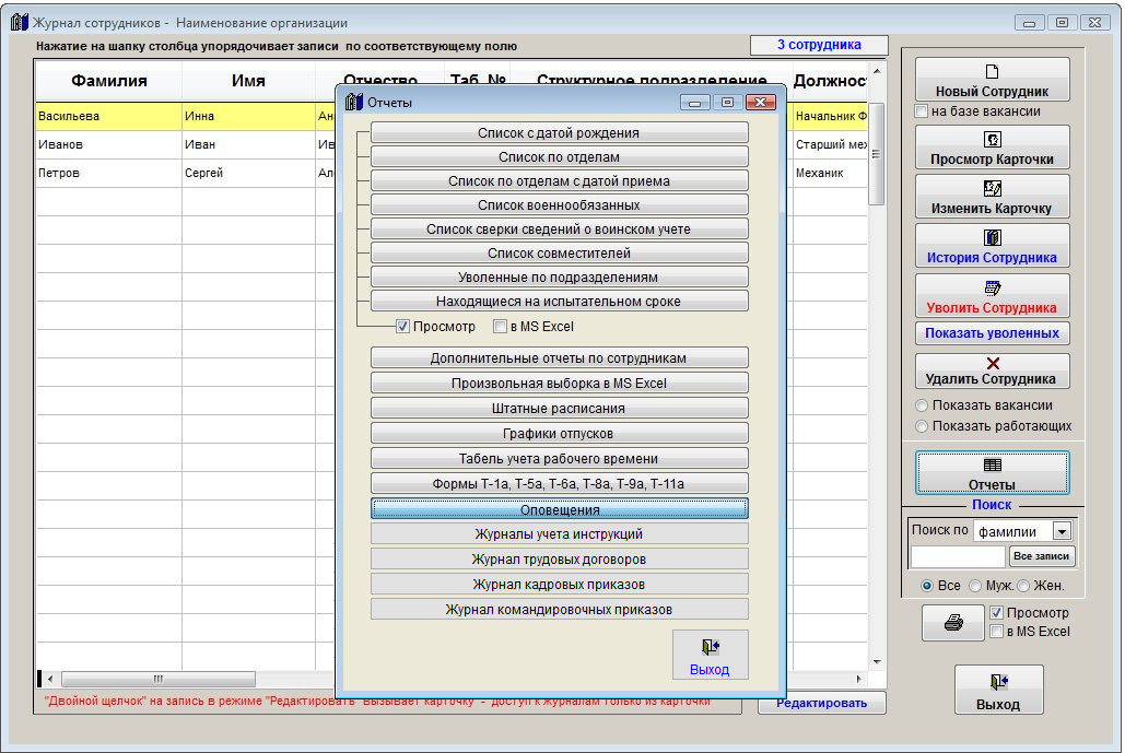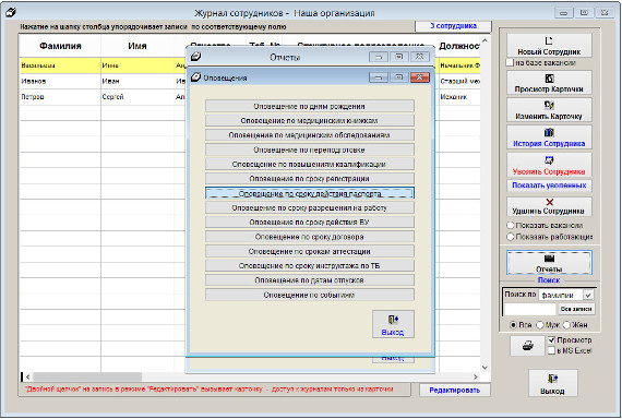 Напоминание появляется при загрузке модуля Сотрудники, также есть возможность просмотра окна напоминания в разделе Отчеты.