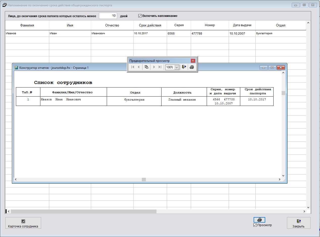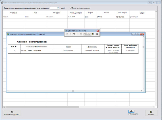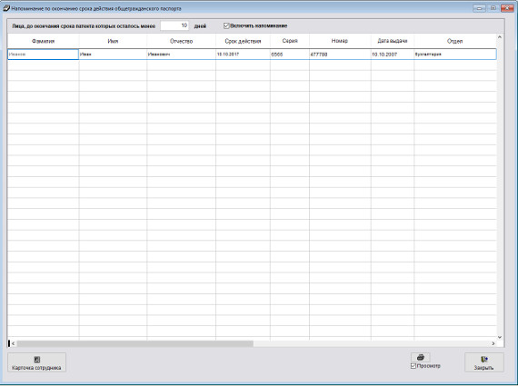 Если в разделе Отчеты-Оповещения-Напоминание по сроку окончания общегражданского паспорта установлена галочка "Включить напоминание", то при запуске модуля Сотрудники откроется окно оповещения по сроку действия общегражданского паспорта.