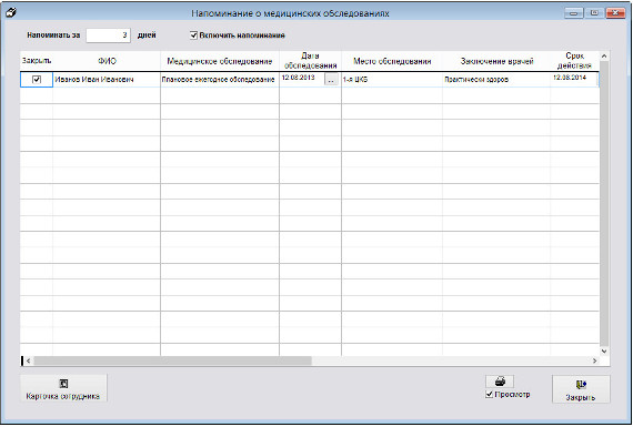 В программе "Сотрудники предприятия" можно организовать оповещение по медицинским обследованиям.