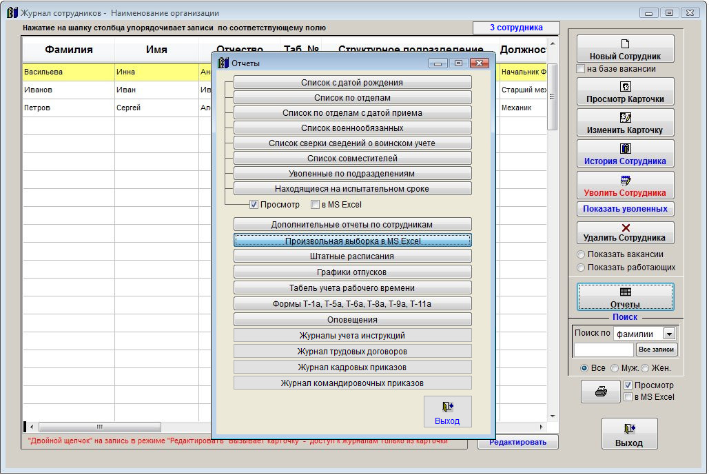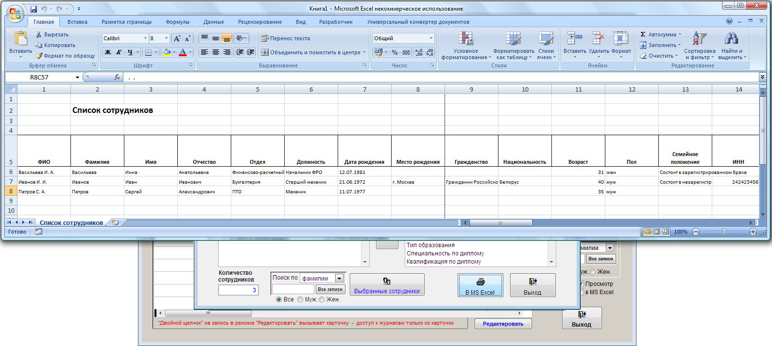 Для вывода списка отобранных сотрудников в установленный Microsoft Excel либо при соответствующей настройке в OpenOffice Calc нажмите кнопку "В MS Excel" (В OO Calc).
