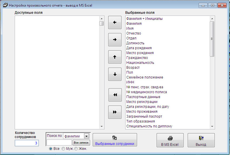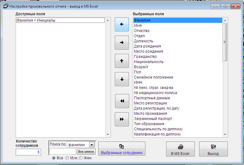В открывшемся окне выберите поля карточек сотрудников, которые требуется выводить в MS Excel (OO Calc).