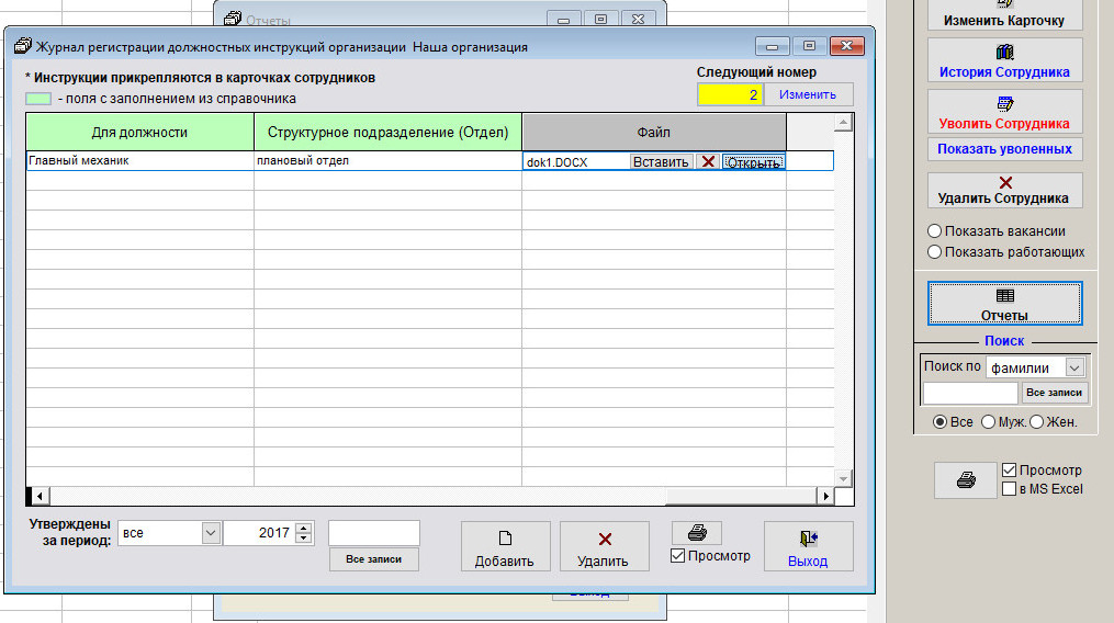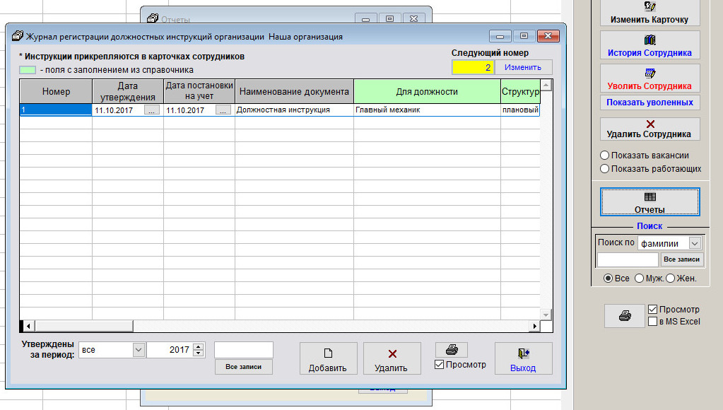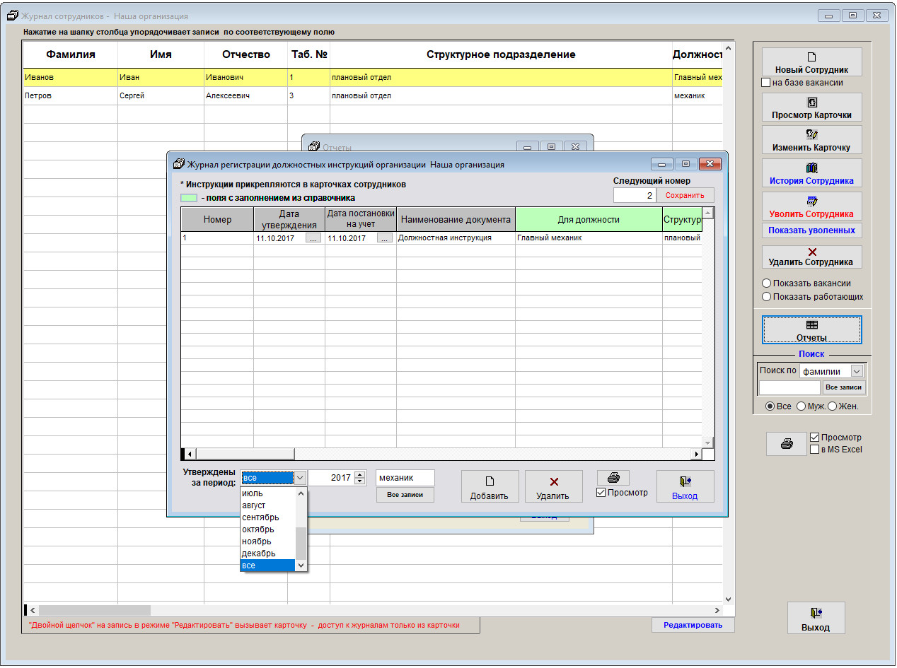 Для печати Журнала регистрации должностных инструкций откройте журнал сотрудников и нажмите кнопку "Отчеты".