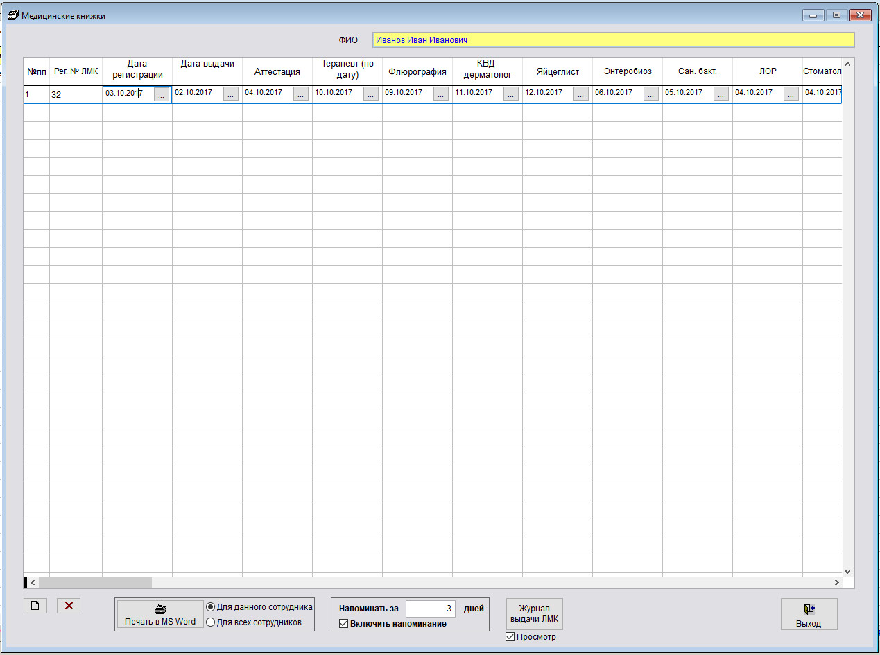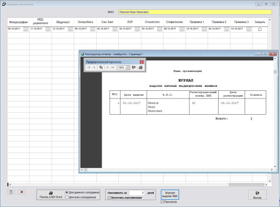 Для печати Журнала выдачи медицинских книжек нажмите кнопку "Журнал выдачи ЛМК".
