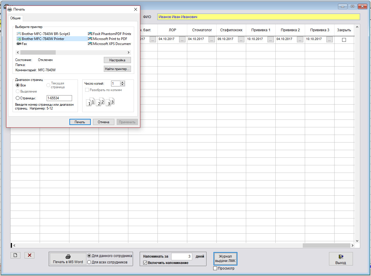 Выберите нужный принтер, установите количество копий и нажмите на кнопку "Печать".
