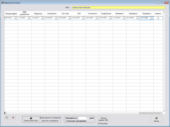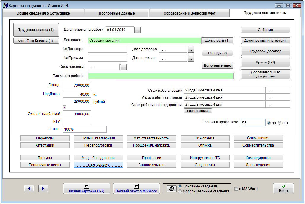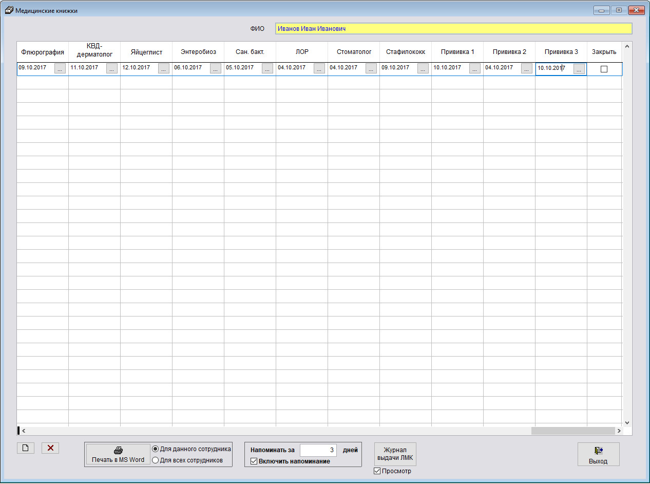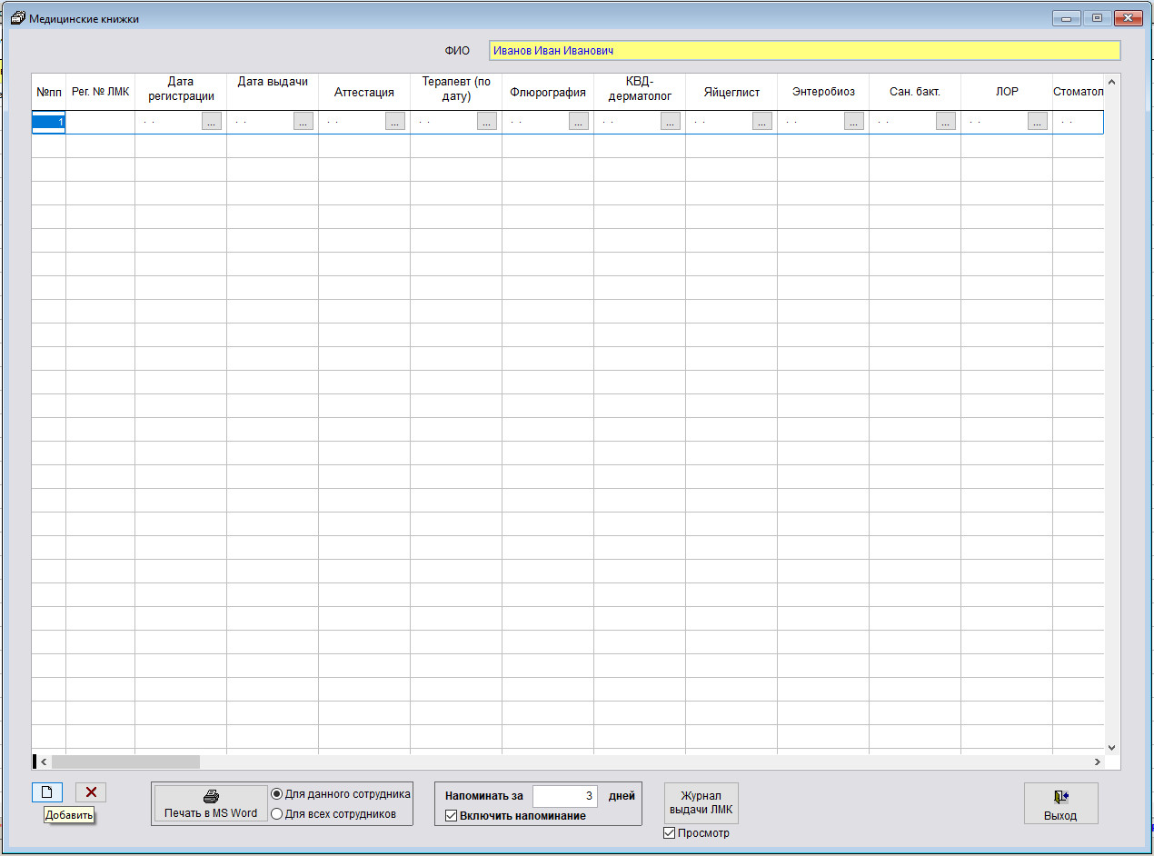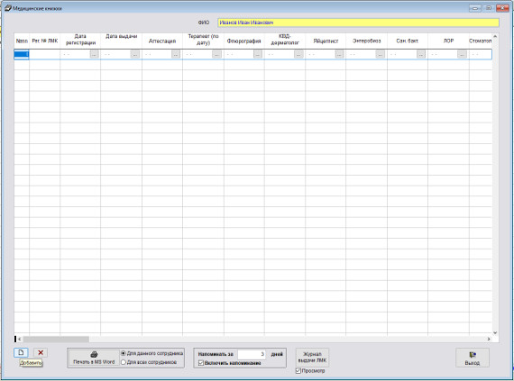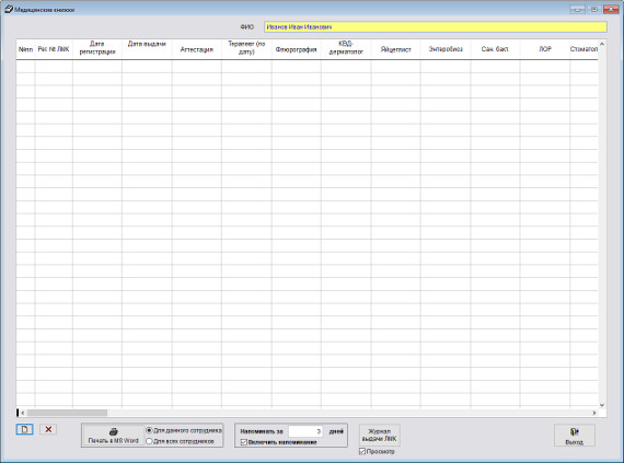 Для печати Журнала выдачи медицинских книжек сотрудников откройте карточку любого сотрудника на редактирование (кнопка Изменить карточку в журнале сотрудников) и нажмите кнопку "Мед. книжка" в закладке "Трудовая деятельность".