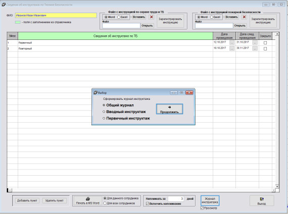 В окне выбора укажите, какой журнал печатать - общий, вводного инструктажа или первичного инструктажа.