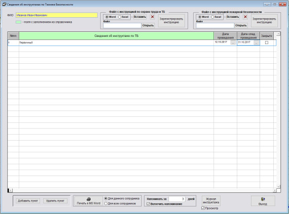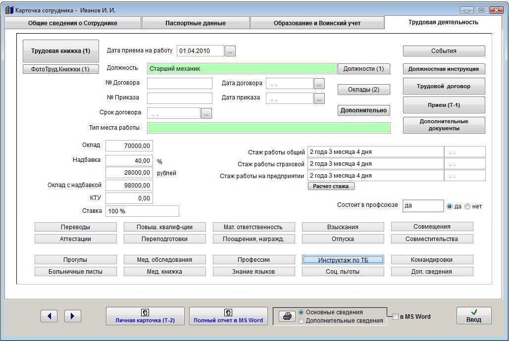 Для печати Журнала инструктажей по технике безопасности сотрудников откройте карточку любого сотрудника и нажмите кнопку "Инструктаж по ТБ" в закладке "Трудовая деятельность".
