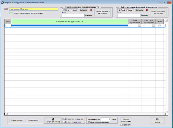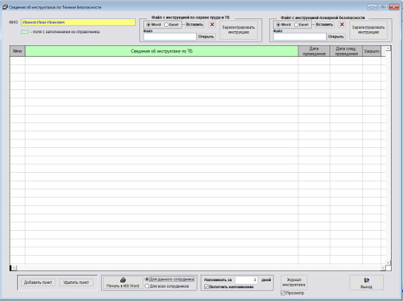Для печати журнала инструктажей по технике безопасности нажмите кнопку "Журнал инструктажа" справа под таблицей инструктажей.