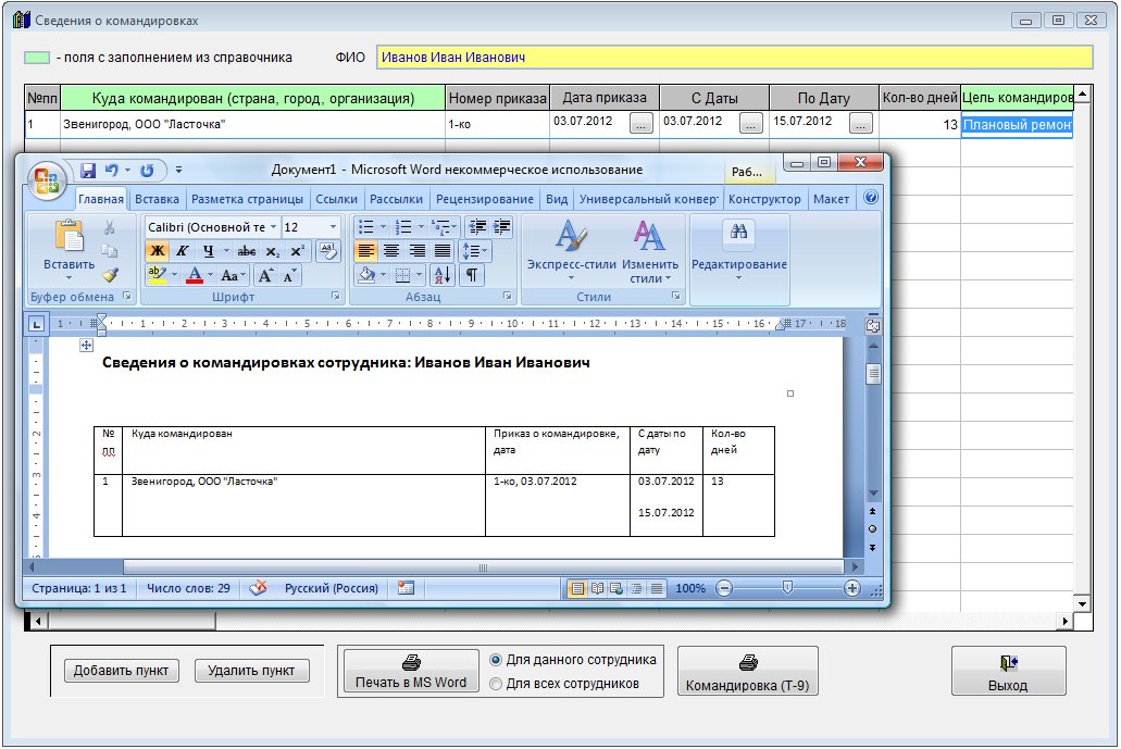 Таблица с записями о командировках сформируется в установленном Microsoft Word либо при соответствующей настройке в OpenOffice Writer.