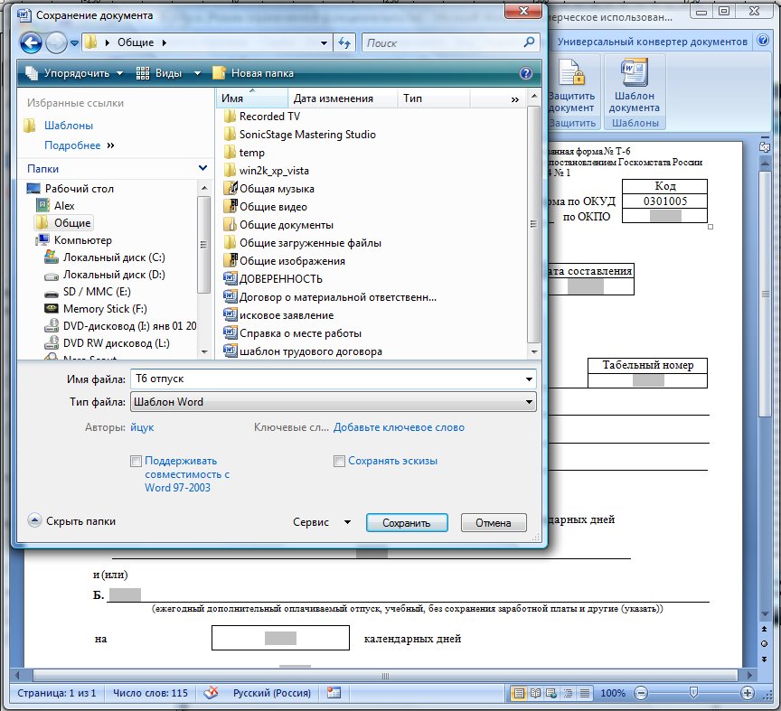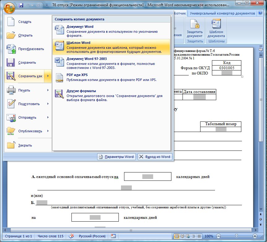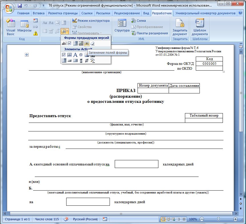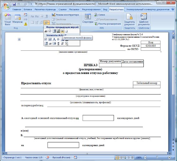 либо открыть на редактирование шаблон любого существующего документа, например приказа из папки Шаблоны документов в папке с программой, который включен в стандартную версию программы.