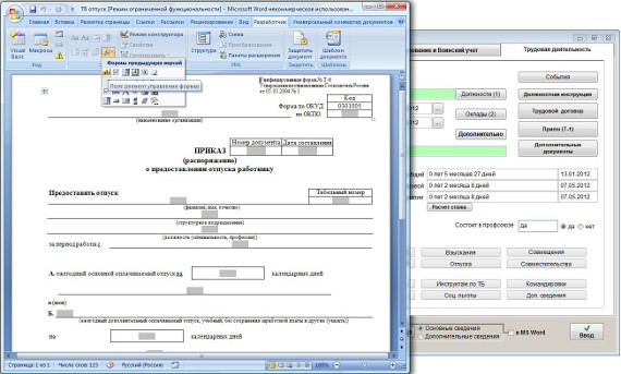 В программе "Сотрудники предприятия" в разделе "Сотрудники" есть возможность печати приказов на базе полей карточки сотрудника, которые формируются в Microsoft Word, либо, при соответствующей