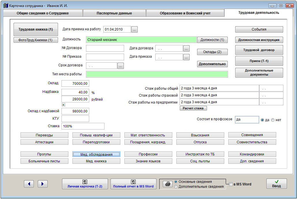Если установлена опция "Для данного сотрудника", то в MS Word (OO Writer) , будет выведена информация только по данному сотруднику.