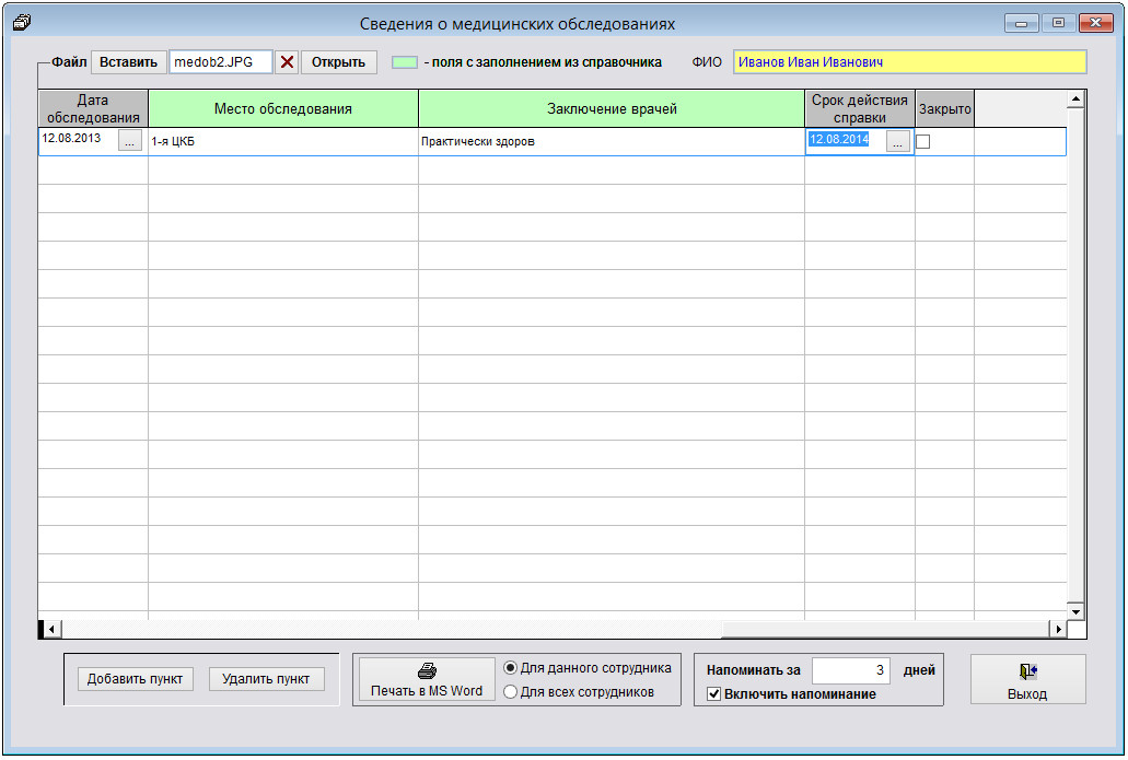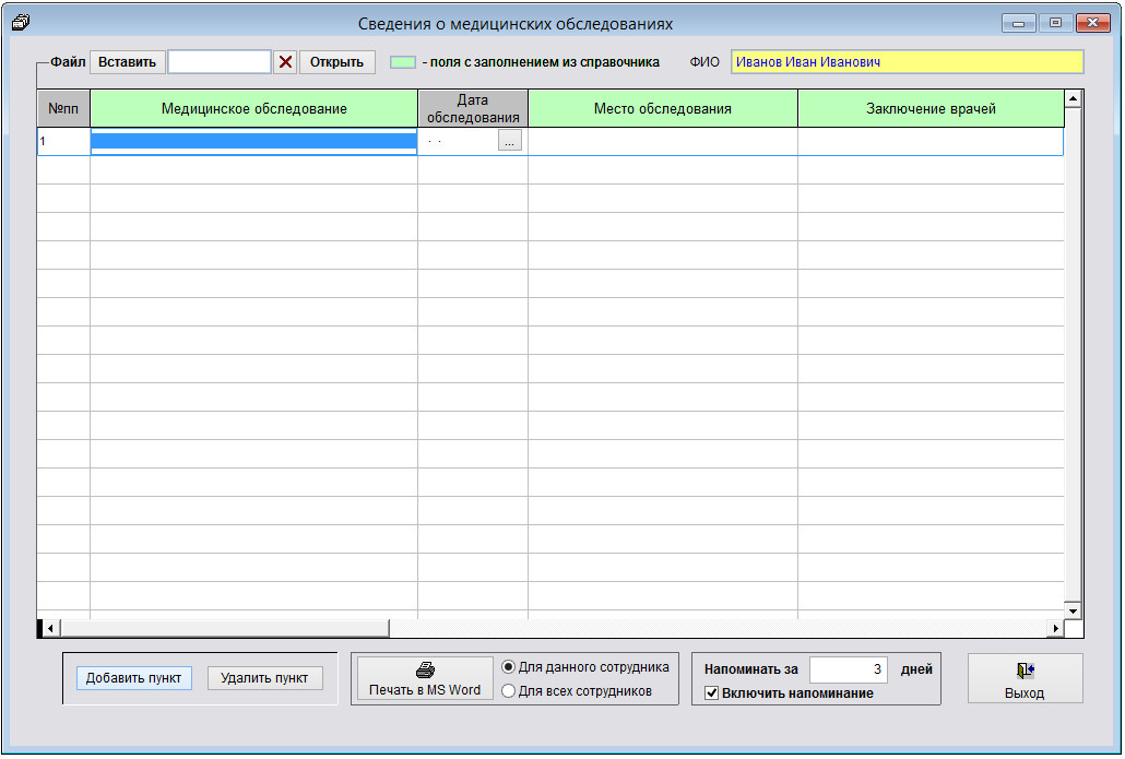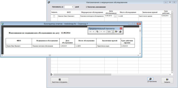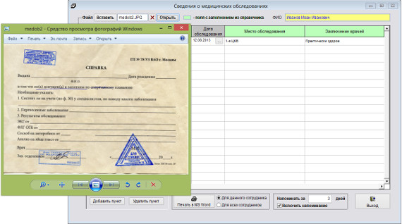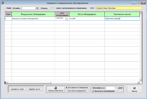 Таблица с записями о медицинских обследованиях сформируется в установленном Microsoft Word либо при соответствующей настройке в OpenOffice Writer.