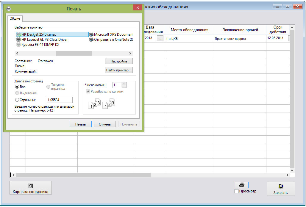Выберите нужный принтер, установите количество копий и нажмите на кнопку "Печать".