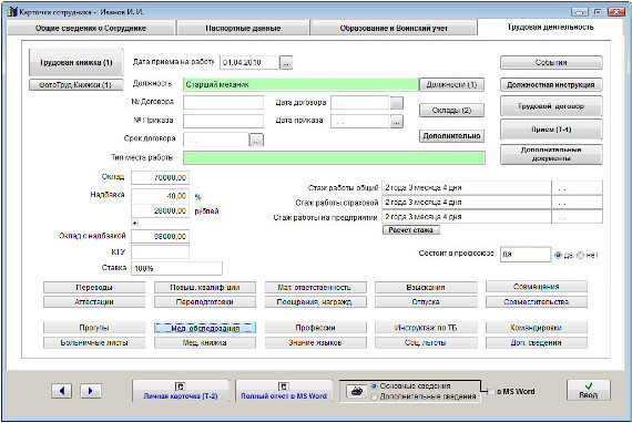 Для внесения записей о медицинских обследованиях сотрудника откройте карточку сотрудника на редактирование (кнопка Изменить карточку в журнале сотрудников) и нажмите кнопку "Мед. обследования" в закладке "Трудовая деятельность".