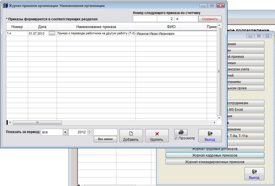 Значение счетчика кадровых приказов, а также префикс и суффикс, можно изменить в журнале кадровых приказов в разделе "Отчеты-Журнал кадровых приказов" в журнале сотрудников.