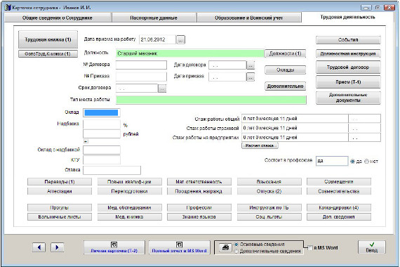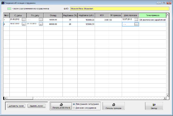 Если установлена опция "Для данного сотрудника", то в MS Word (OO Writer) , будет выведена информация только по данному сотруднику.