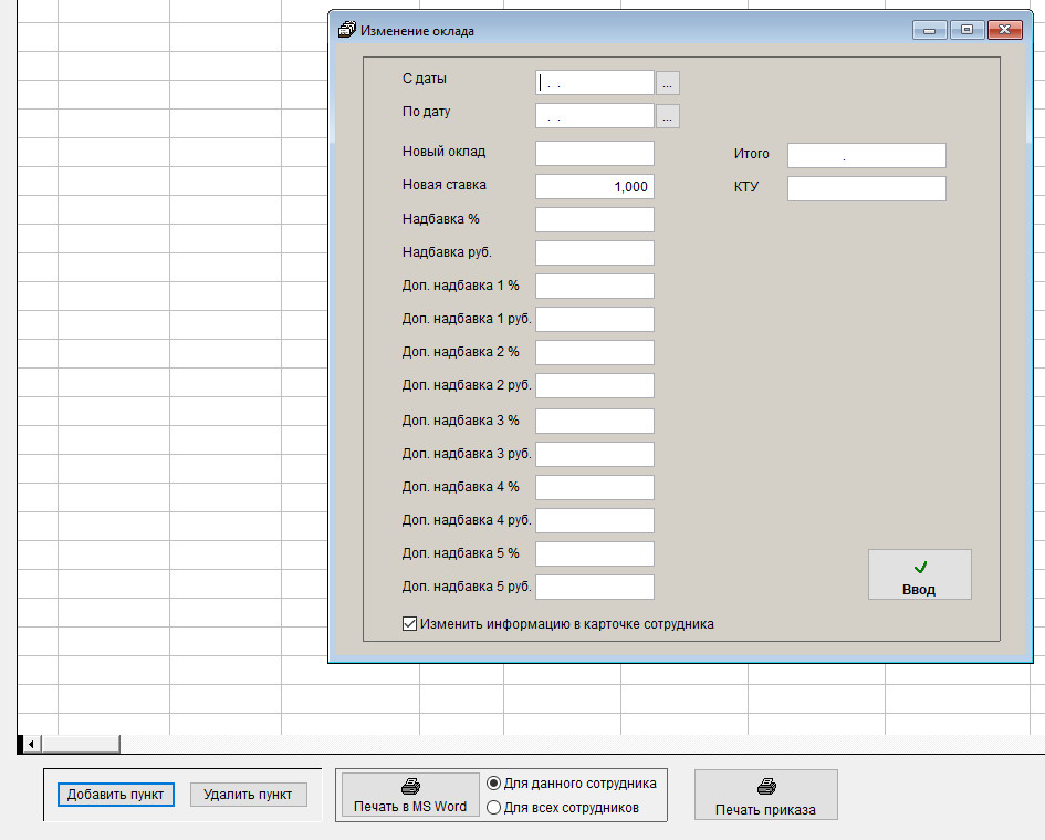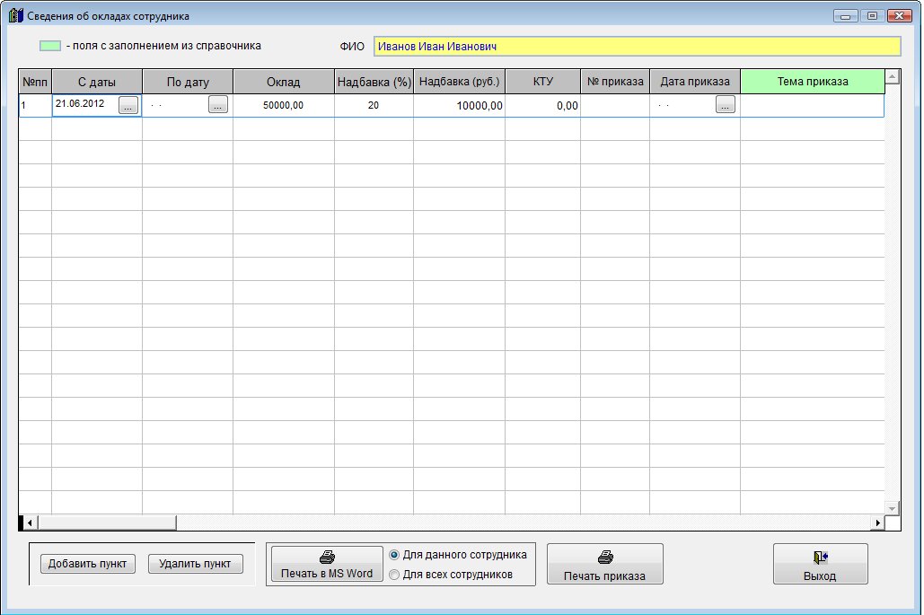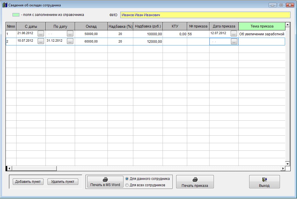 Для добавления записи об изменении оклада нажмите кнопку Добавить пункт.