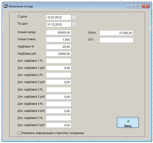 Заполните даты и значения оклада, установите галочку "Изменить информацию в карточке сотрудника", если требуется поменять значения оклада в закладке Трудовая деятельность в карточке сотрудника и нажмите кнопку Ввод.