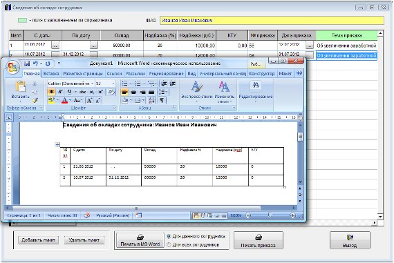 Таблица с записями об изменении оклада сформируется в установленном Microsoft Word либо при соответствующей настройке в OpenOffice Writer.
