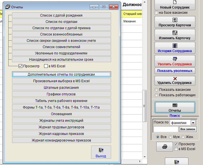 Для печати отчетов "Медицинские обследования" (за период и отсутствующие) откройте журнал сотрудников и нажмите кнопку "Отчеты".