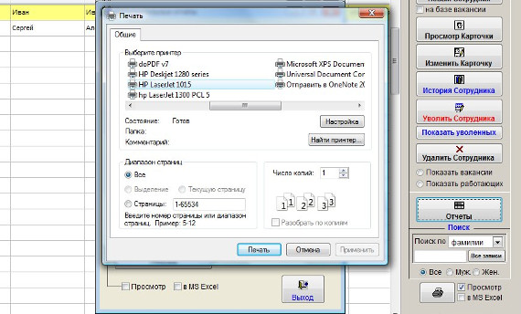Выберите нужный принтер, установите количество копий и нажмите на кнопку "Печать".