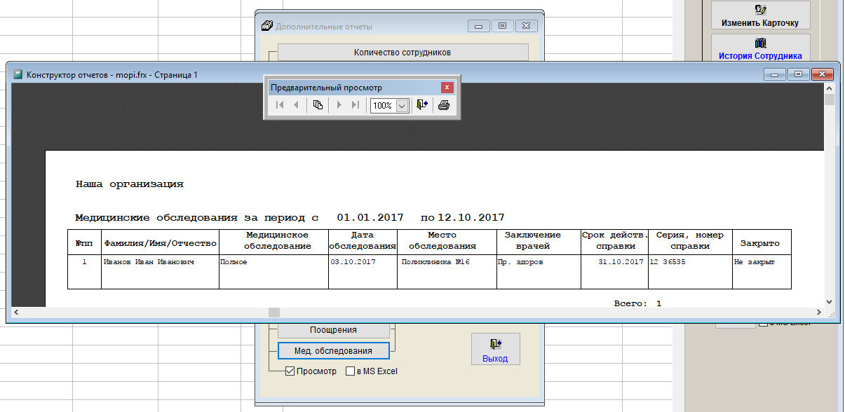 Если была выбрана опция "Нет", откроется отчет "Список сотрудников без медобследований".
