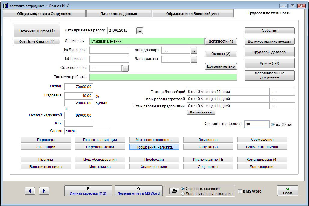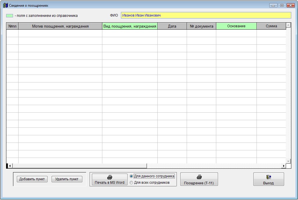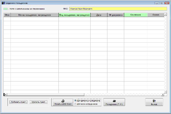 Если установлена опция "Для данного сотрудника", то в MS Word (OO Writer) , будет выведена информация только по данному сотруднику.
