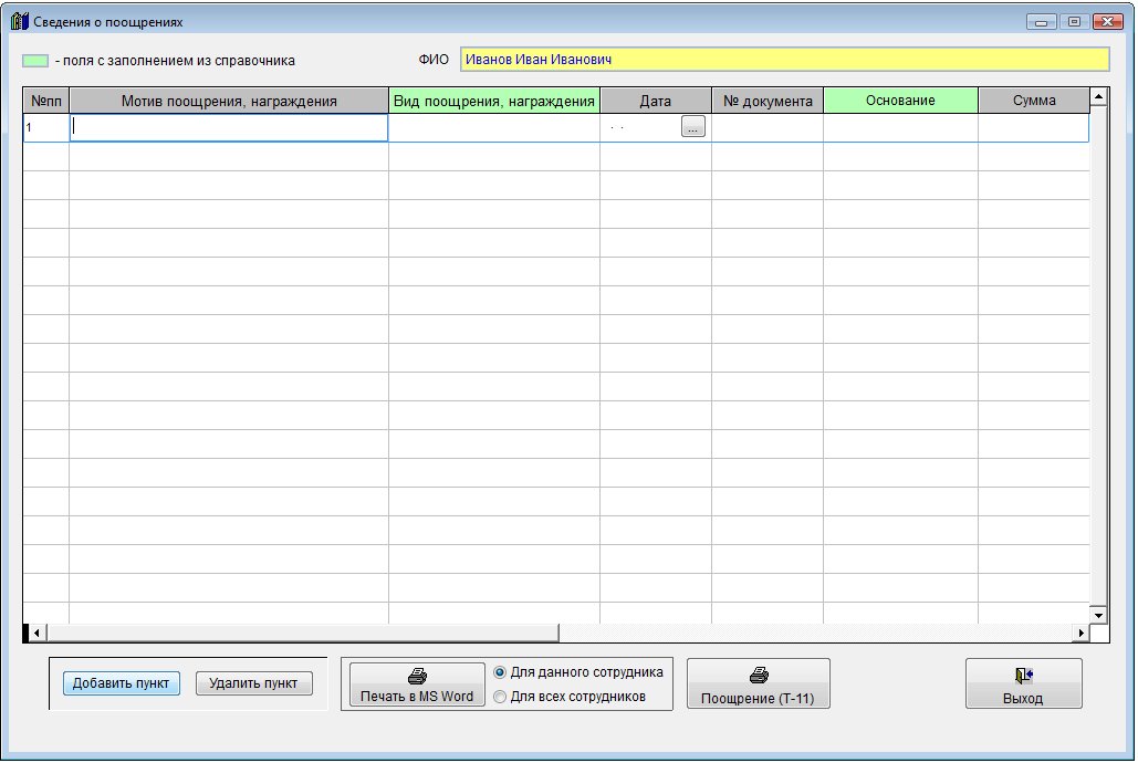Для печати записей о поощрениях и награждениях используйте нажмите кнопку "Печать в MS Word".