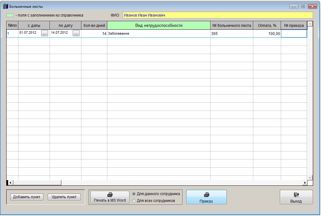 Предварительно должна быть добавлена запись с информацией по больничному листу.
