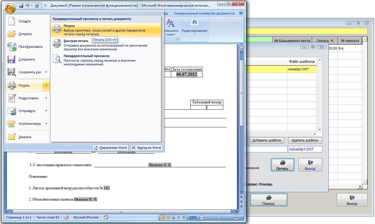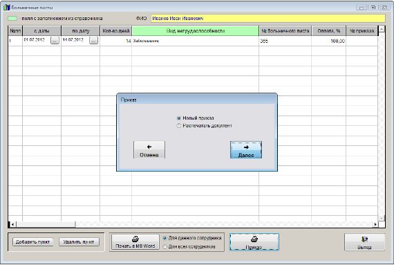 Приказ по больничному листу сформируется в установленном Microsoft Word либо при соответствующей настройке в OpenOffice Writer.