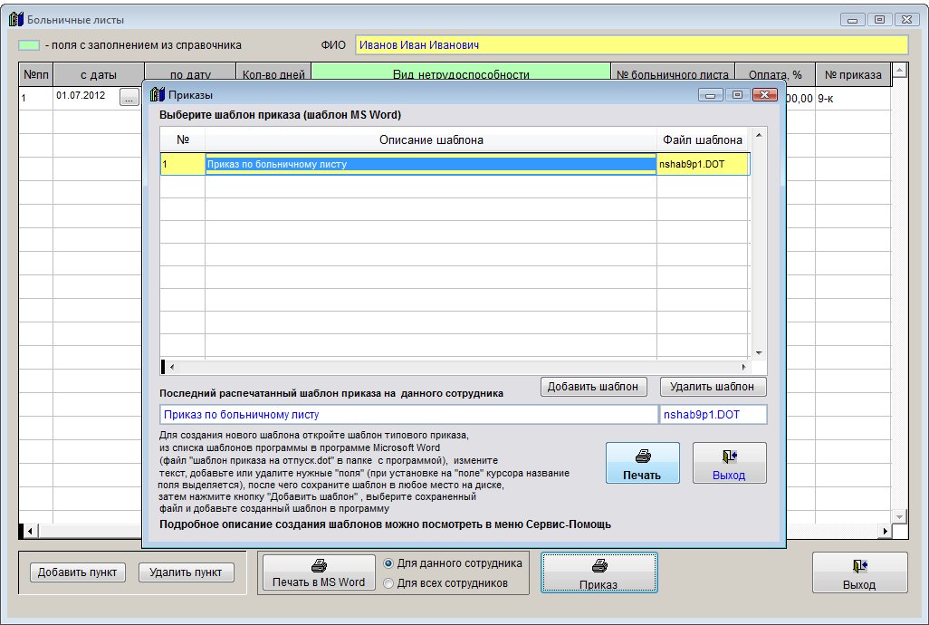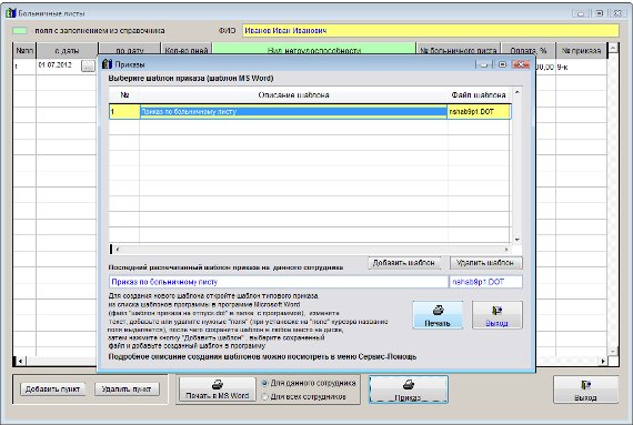 Откроется окно, в котором можно распечатать приказ по больничному листу на базе шаблона, добавить в программу свои шаблоны приказов.