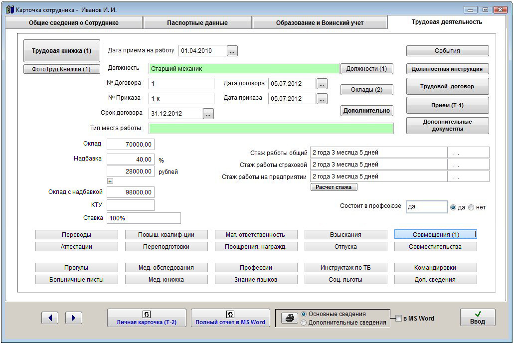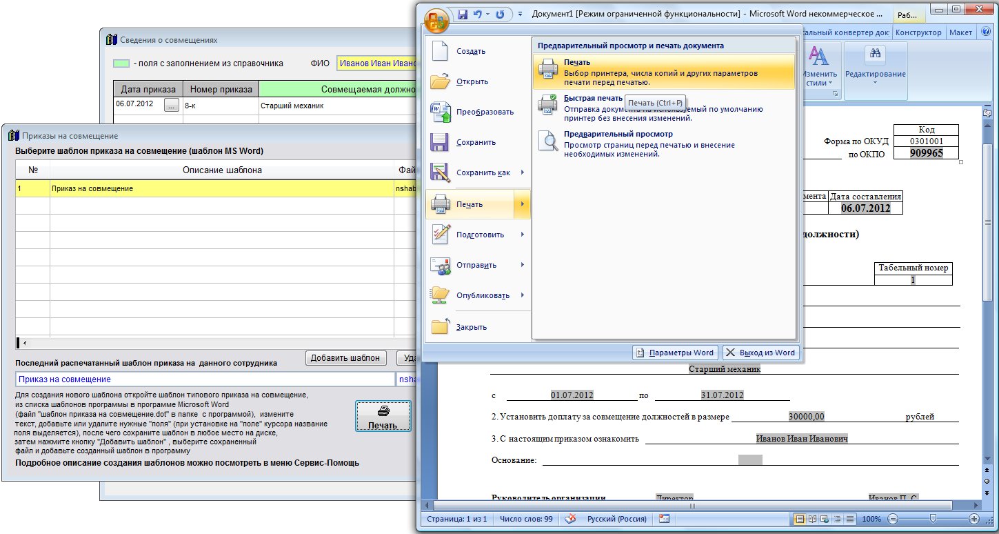 Приказ о совмещении сформируется в установленном Microsoft Word либо при соответствующей настройке в OpenOffice Writer.