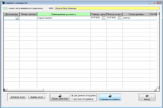 Для печати приказа о совмещении сотрудника в разделе "Сведения о совмещениях" выберите нужную запись в таблице и нажмите кнопку "Совмещения (приказ)".
