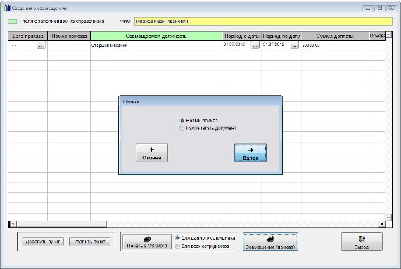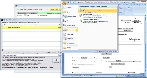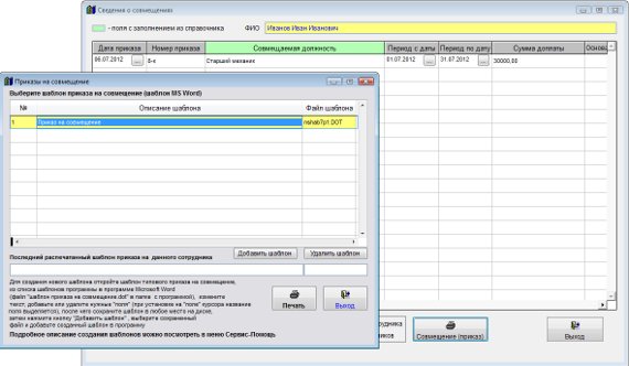 Откроется окно, в котором можно распечатать приказ о совмещении на базе шаблона, добавить в программу свои шаблоны приказов.