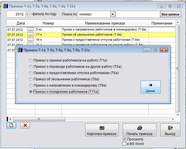 Затем выберите приказ, который требуется создать, Приказ о поощрении (Т11а), и нажмите кнопку Далее.
