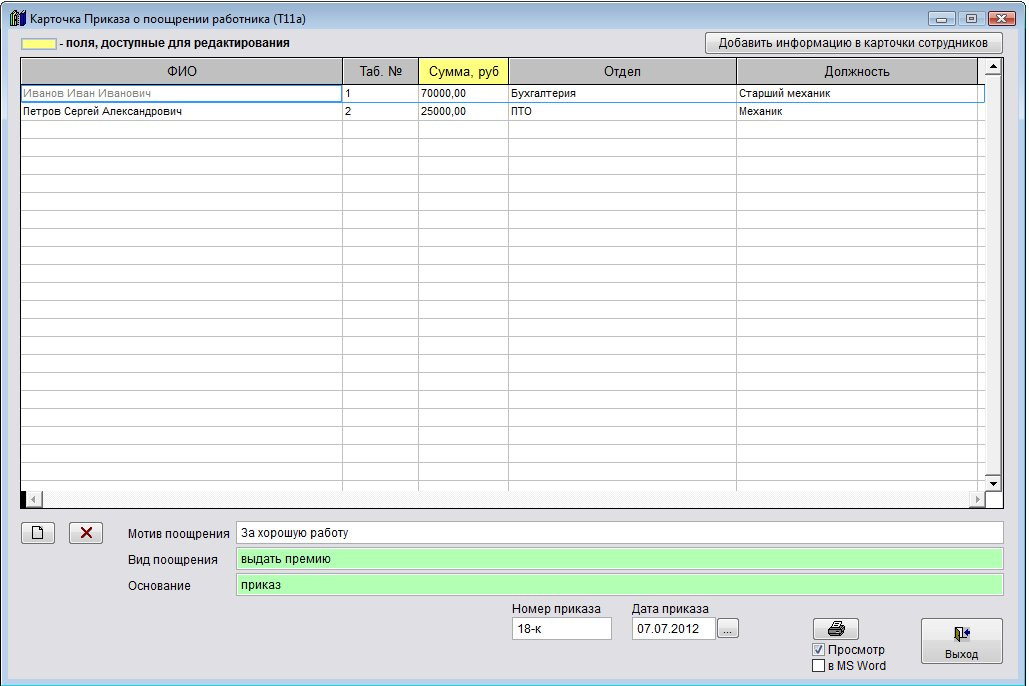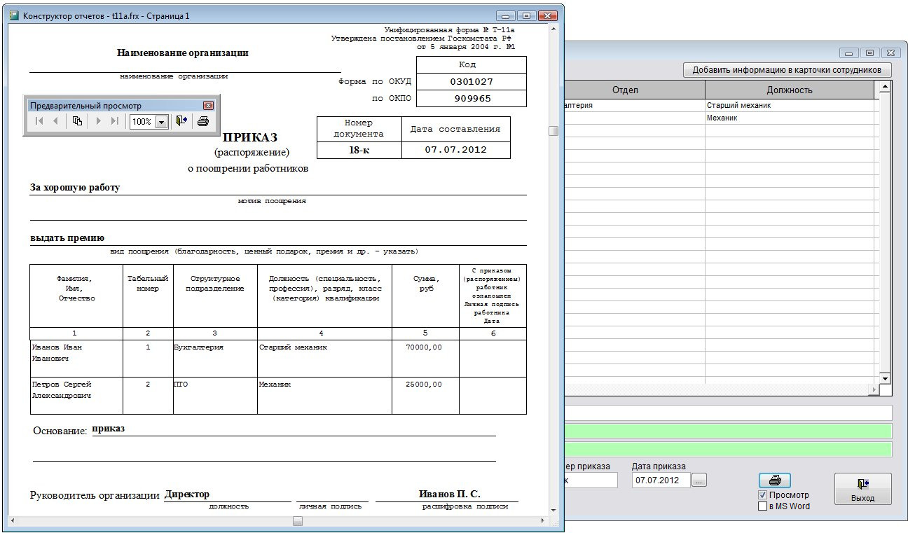 Как распечатать групповой приказ о поощрении Т-11а