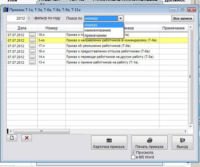 Возможен поиск по номеру, наименованию приказа и примечанию.