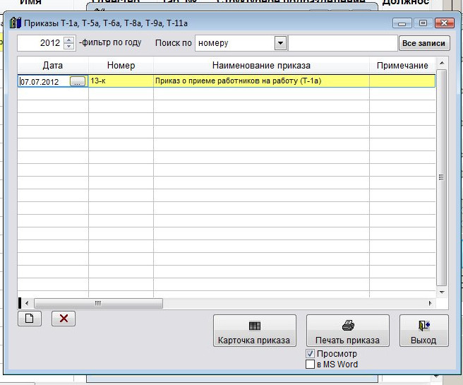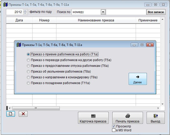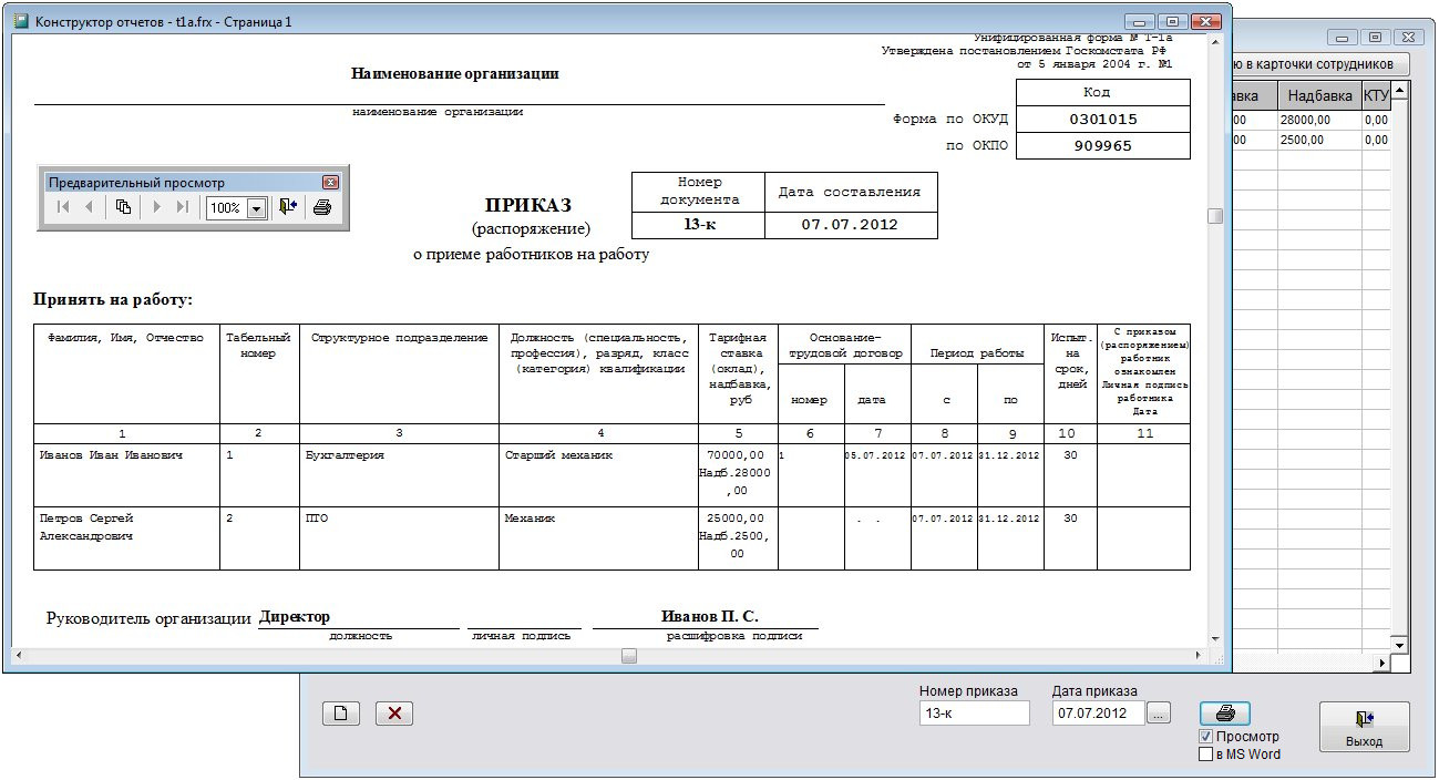 Как распечатать групповой приказ о приеме на работу Т-1а