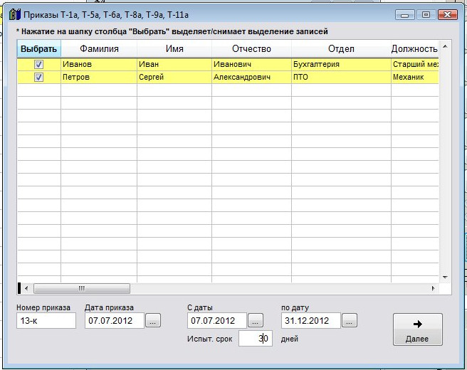 Галочками выберите сотрудников, на которых формируется приказ (для выбора всех сотрудников нажмите на шапку столбца Выбрать), установите даты и испытательный срок и нажмите кнопку Далее.