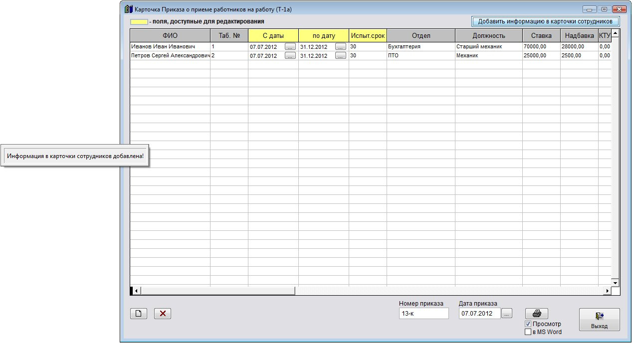 Для занесения информации о приказе в соответствующий раздел карточек сотрудников нажмите кнопку "Занести информацию в карточки сотрудников".