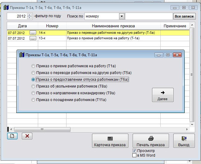 Затем выберите приказ, который требуется создать, Приказ на отпуск (Т6а), и нажмите кнопку Далее.