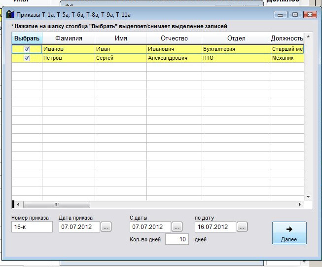 Галочками выберите сотрудников, на которых формируется приказ (для выбора всех сотрудников нажмите на шапку столбца Выбрать), установите дату начала отпуска и количество дней, дата окончания посчитается автоматически с учетом внесенных в программу праздничных дней (в разделе Отпуска в карточке сотрудника), и нажмите кнопку Далее.