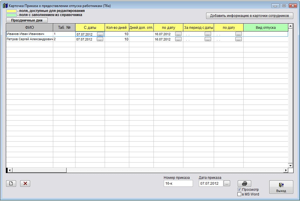 Для занесения информации о приказе в соответствующий раздел карточек сотрудников нажмите кнопку "Занести информацию в карточки сотрудников".