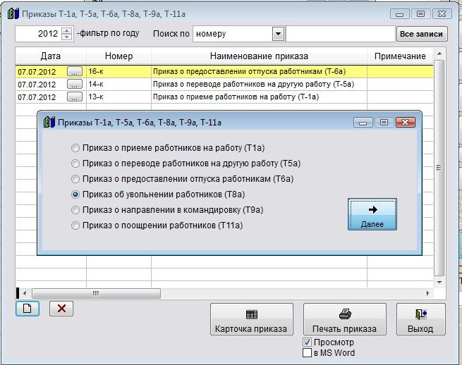 Затем выберите приказ, который требуется создать, Приказ на увольнение (Т8а), и нажмите кнопку Далее.