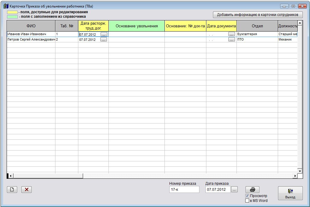 Для занесения информации о приказе в соответствующий раздел карточек сотрудников нажмите кнопку "Занести информацию в карточки сотрудников".